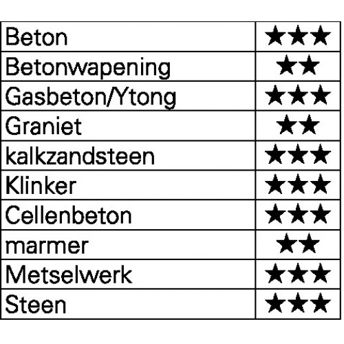 Gecertificeerd door de testgemeenschap muurboren (PGM) volgens voorschriften van het Duitse Instituut voor bouwtechniek (DIBt)Toepassingsgebieden: Beton, betonwapening, metselwerk, natuursteen, kalkzandsteen, tegels, marmer, klinker