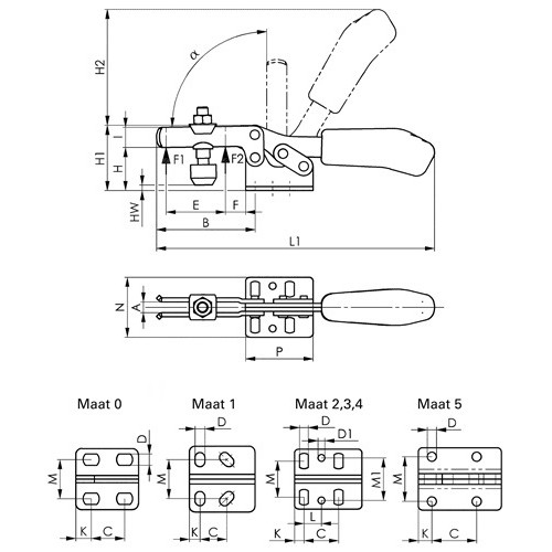 Met horizontale voetOverige technische gegevens: A: 5mm C: 13-14,5mm D: 5,2mm Aandrukschroef: M5 x 30 HW min.: -3mm L1: 120mm HW max.: 2,5mm H1: 30mm F1: 0,8kN H2: 49mm Totale hoogte: 30mm a*: 90° Constructie: Horizontale voet I: 10mm F2: 1,1kN F: 8mm B: 42mm P: 34mm K: 5,5mm E: 18,7mm M: 18-21,5mm h: 19mm N: 34mm Totale lengte: 119mm